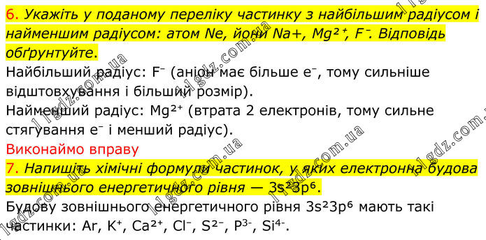 6. Укажіть у поданому переліку частинку з найбільшим радіусом і найменшим радіусом: атом Ne, йони Na+, Mg²⁺, F⁻. Відповідь обґрунтуйте. Найбільший радіус: F⁻ (анiон має більше e⁻, тому сильніше відштовхування і більший розмір). Найменший радіус: Mg²⁺ (втрата 2 електронів, тому сильне стягування e⁻ і менший радіус). Виконаймо вправу 7. Напишіть хімічні формули частинок, у яких електронна будова зовнішнього енергетичного рівня — 3s²3p⁶. Будову зовнішнього енергетичного рівня 3s²3p⁶ мають такі частинки: Аr, K⁺, Ca²⁺, Cl⁻, S²⁻, Р3-, Sі4-.