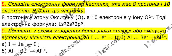 8. Складіть електронну формулу частинки, яка має 8 протонів і 10 електронів. Назвіть цю частинку. 8 протонів у атому Оксигену (O), а 10 електронів у іону O²⁻. Тоді електронна формула: 1s²2s²2p⁶. 9. Допишіть у схеми утворення йонів знаки «плюс» або «мінус» і відповідну кількість електронів: а) І ... e⁻ → І; б) Al ... 3e⁻ → Al³⁺. а) I + 1e⁻ → I⁻; б) Al − 3e⁻ → Al³⁺.
