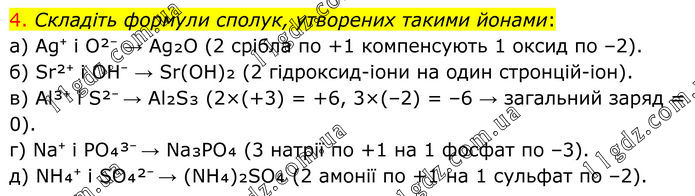 4. Складіть формули сполук, утворених такими йонами: а) Ag⁺ і O²⁻ → Ag₂O (2 срібла по +1 компенсують 1 оксид по –2). б) Sr²⁺ і OH⁻ → Sr(OH)₂ (2 гідроксид-іони на один стронцій-іон). в) Al³⁺ і S²⁻ → Al₂S₃ (2×(+3) = +6, 3×(–2) = –6 → загальний заряд = 0). г) Na⁺ і PO₄³⁻ → Na₃PO₄ (3 натрії по +1 на 1 фосфат по –3). д) NH₄⁺ і SO₄²⁻ → (NH₄)₂SO₄ (2 амонії по +1 на 1 сульфат по –2).