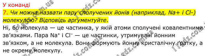 У команді 7. Чи можна назвати пару сполучених йонів (наприклад, Na+ і Cl-) молекулою? Відповідь аргументуйте. Ні, бо молекула — це частинка, у якій атоми сполучені ковалентними зв’язками. Пара Na⁺ і Cl⁻ — це частинки, утримувані йонним зв’язком, а не молекула. Вони формують йонну кристалічну ґратку, а не окрему молекулу.