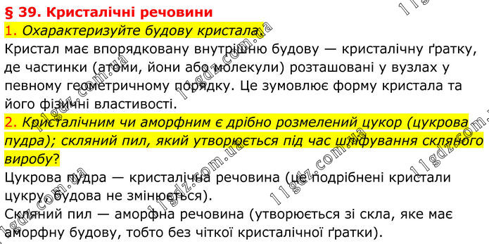 § 39. Кристалічні речовини 1. Охарактеризуйте будову кристала. Кристал має впорядковану внутрішню будову — кристалічну ґратку, де частинки (атоми, йони або молекули) розташовані у вузлах у певному геометричному порядку. Це зумовлює форму кристала та його фізичні властивості. 2. Кристалічним чи аморфним є дрібно розмелений цукор (цукрова пудра); скляний пил, який утворюється під час шліфування скляного виробу? Цукрова пудра — кристалічна речовина (це подрібнені кристали цукру, будова не змінюється). Скляний пил — аморфна речовина (утворюється зі скла, яке має аморфну будову, тобто без чіткої кристалічної ґратки).