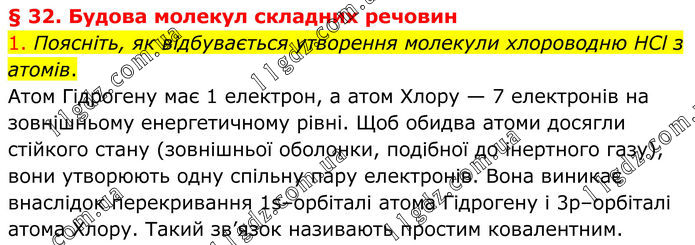 § 32. Будова молекул складних речовин 1. Поясніть, як відбувається утворення молекули хлороводню HCl з атомів. Атом Гідрогену має 1 електрон, а атом Хлору — 7 електронів на зовнішньому енергетичному рівні. Щоб обидва атоми досягли стійкого стану (зовнішньої оболонки, подібної до інертного газу), вони утворюють одну спільну пару електронів. Вона виникає внаслідок перекривання 1s–орбіталі атома Гідрогену і 3p–орбіталі атома Хлору. Такий зв’язок називають простим ковалентним.