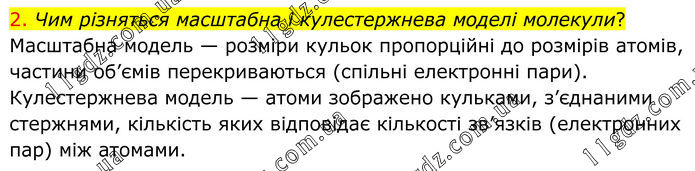 2. Чим різняться масштабна і кулестержнева моделі молекули? Масштабна модель — розміри кульок пропорційні до розмірів атомів, частини об’ємів перекриваються (спільні електронні пари). Кулестержнева модель — атоми зображено кульками, з’єднаними стержнями, кількість яких відповідає кількості зв’язків (електронних пар) між атомами.