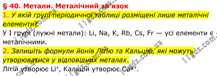 § 40. Метали. Металічний зв’язок 1. У якій групі періодичної таблиці розміщені лише металічні елементи? У І групі (лужні метали): Li, Na, K, Rb, Cs, Fr — усі елементи є металічними. 2. Запишіть формули йонів Літію та Кальцію, які можуть утворюватися у відповідних металах. Літій утворює Li⁺, Кальцій утворює Ca²⁺.