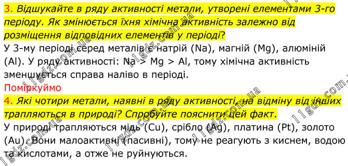 3. Відшукайте в ряду активності метали, утворені елементами 3-го періоду. Як змінюється їхня хімічна активність залежно від розміщення відповідних елементів у періоді? У 3-му періоді серед металів є натрій (Na), магній (Mg), алюміній (Al). У ряду активності: Na > Mg > Al, тому хімічна активність зменшується справа наліво в періоді. Поміркуймо 4. Які чотири метали, наявні в ряду активності, на відміну від інших трапляються в природі? Спробуйте пояснити цей факт. У природі трапляються мідь (Cu), срібло (Ag), платина (Pt), золото (Au). Вони малоактивні (пасивні), тому не реагують з киснем, водою та кислотами, а отже не руйнуються.