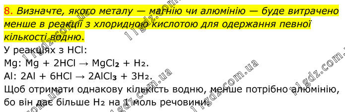 8. Визначте, якого металу — магнію чи алюмінію — буде витрачено менше в реакції з хлоридною кислотою для одержання певної кількості водню. У реакціях з HCl: Mg: Mg + 2HCl → MgCl2 + H₂. Al: 2Al + 6HCl → 2AlCl3 + 3H₂. Щоб отримати однакову кількість водню, менше потрібно алюмінію, бо він дає більше H₂ на 1 моль речовини.
