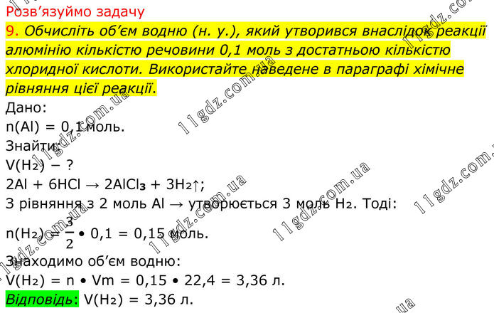 Розв’язуймо задачу 9. Обчисліть об’єм водню (н. у.), який утворився внаслідок реакції алюмінію кількістю речовини 0,1 моль з достатньою кількістю хлоридної кислоти. Використайте наведене в параграфі хімічне рівняння цієї реакції. Дано: n(Al) = 0,1 моль. Знайти: V(H₂) − ? 2Al + 6HCl → 2AlCl3 + 3H₂↑; З рівняння з 2 моль Al → утворюється 3 моль H₂. Тоді: n(H₂) = 3/2 • 0,1 = 0,15 моль. Знаходимо об’єм водню: V(H₂) = n • Vm = 0,15 • 22,4 = 3,36 л. Відповідь: V(H₂) = 3,36 л.