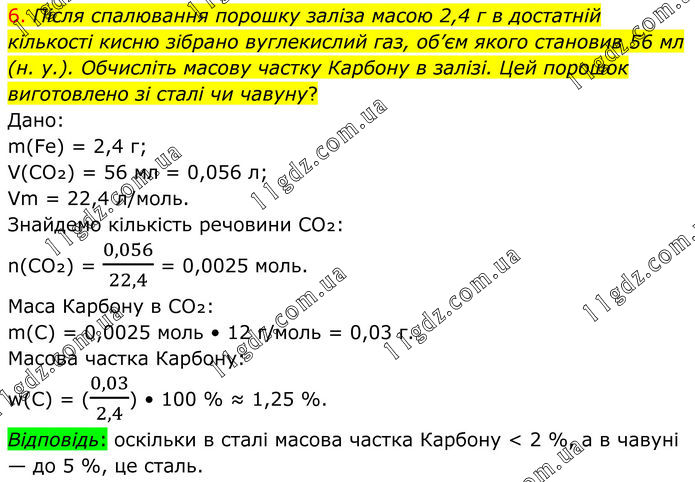 6. Після спалювання порошку заліза масою 2,4 г в достатній кількості кисню зібрано вуглекислий газ, об’єм якого становив 56 мл (н. у.). Обчисліть масову частку Карбону в залізі. Цей порошок виготовлено зі сталі чи чавуну? Дано: m(Fe) = 2,4 г; V(CO₂) = 56 мл = 0,056 л; Vm = 22,4 л/моль. Знайдемо кількість речовини CO₂: n(CO₂) = 0,056/22,4 = 0,0025 моль. Маса Карбону в CO₂: m(C) = 0,0025 моль • 12 г/моль = 0,03 г. Масова частка Карбону: w(C) = (0,03/2,4) • 100 % ≈ 1,25 %. Відповідь: оскільки в сталі масова частка Карбону < 2 %, а в чавуні — до 5 %, це сталь.