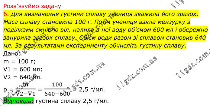 Розв’язуймо задачу 6. Для визначення густини сплаву учениця зважила його зразок. Маса сплаву становила 100 г. Потім учениця взяла мензурку з поділками ємністю віл, налила в неї воду об’ємом 600 мл і обережно занурила зразок сплаву. Об’єм води разом зі сплавом становив 640 мл. За результатами експерименту обчисліть густину сплаву. Дано: m = 100 г; V1 = 600 мл; V2 = 640 мл. ρ = m/(V2-V1) = 100/(640-600) = 2,5 г/мл. Відповідь: густина сплаву 2,5 г/мл.