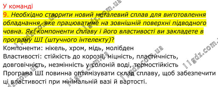 У команді 9. Необхідно створити новий металевий сплав для виготовлення обладнання, яке працюватиме на зовнішній поверхні підводного човна. Які компоненти сплаву і його властивості ви закладете в програму ШІ (штучного інтелекту)? Компоненти: нікель, хром, мідь, молібден Властивості: стійкість до корозії, міцність, пластичність, довговічність, незмінність у солоній воді, термостійкість Програма ШІ повинна оптимізувати склад сплаву, щоб забезпечити ці властивості при мінімальній вазі й вартості.