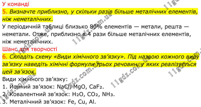 У команді 5. Визначте приблизно, у скільки разів більше металічних елементів, ніж неметалічних. У періодичній таблиці близько 80% елементів — метали, решта — неметали. Отже, приблизно в 4 рази більше металічних елементів, ніж неметалічних. Шанс для творчості 6. Складіть схему «Види хімічного зв’язку». Під назвою кожного виду зв’язку наведіть хімічні формули трьох речовин, у яких реалізується цей зв’язок. Види хімічного зв’язку: 1. Йонний зв’язок: NaCl, MgO, CaF₂. 2. Ковалентний зв’язок: H₂O, CO₂, NH₃. 3. Металічний зв’язок: Fe, Cu, Al.
