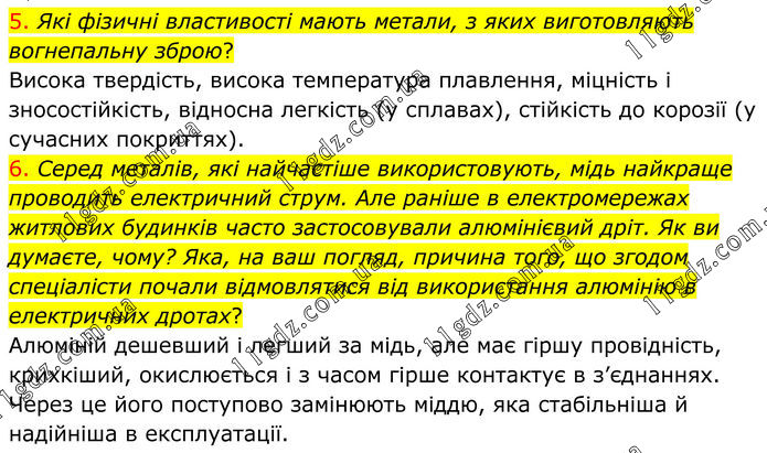 5. Які фізичні властивості мають метали, з яких виготовляють вогнепальну зброю? Висока твердість, висока температура плавлення, міцність і зносостійкість, відносна легкість (у сплавах), стійкість до корозії (у сучасних покриттях). 6. Серед металів, які найчастіше використовують, мідь найкраще проводить електричний струм. Але раніше в електромережах житлових будинків часто застосовували алюмінієвий дріт. Як ви думаєте, чому? Яка, на ваш погляд, причина того, що згодом спеціалісти почали відмовлятися від використання алюмінію в електричних дротах? Алюміній дешевший і легший за мідь, але має гіршу провідність, крихкіший, окислюється і з часом гірше контактує в з’єднаннях. Через це його поступово замінюють міддю, яка стабільніша й надійніша в експлуатації.