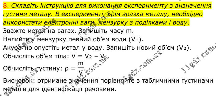 8. Складіть інструкцію для виконання експерименту з визначення густини металу. В експерименті, крім зразка металу, необхідно використати електронні ваги, мензурку з поділками і воду. Зважте метал на вагах. Запишіть масу m. Налийте у мензурку певний об’єм води (V₁). Акуратно опустіть метал у воду. Запишіть новий об’єм (V₂). Обчисліть об’єм тіла: V = V₂ – V₁. Обчисліть густину: ρ = m/V. Висновок: отримане значення порівняйте з табличними густинами металів для ідентифікації речовини.