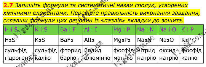 2.7 Запишіть формули та систематичні назви сполук, утворених хімічними елементами. Перевірте правильність виконання завдання, склавши формули цих речовин із «пазлів» вкладки до зошита. H i S K i S Ba i F Al i I Mg i P Na i N Na i O K i P H₂S K₂S BaF₂ AlI₃ Mg₃P₂ Na₃N Na₂O K₃P сульфід гідрогену сульфід калію фторид барію йодид алюмінію фосфід магнію нітрид натрію оксид натрію фосфід калію