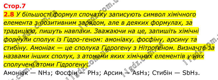 2.8 У більшості формул спочатку записують символ хімічного елемента з позитивним зарядом, але в деяких формулах, за традицією, пишуть навпаки. Зважаючи на це, запишіть хімічні формули сполук із Гідро-геном: амоніаку, фосфіну, арсину та стибіну. Амоніак — це сполука Гідрогену з Нітрогеном. Визначте за назвами інших сполук, з атомами яких хімічних елементів у них сполучені атоми Гідрогену. Амоніак — NH₃; Фосфін — PH₃; Арсин — AsH₃; Стибін — SbH₃.