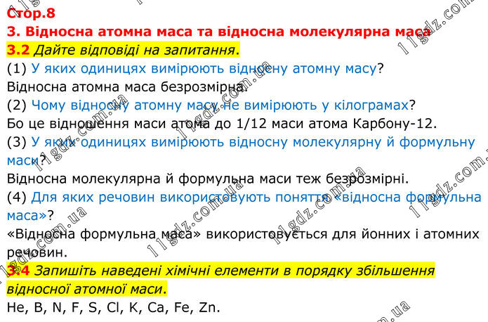 3. Відносна атомна маса та відносна молекулярна маса 3.2 Дайте відповіді на запитання. (1) У яких одиницях вимірюють відносну атомну масу? Відносна атомна маса безрозмірна. (2) Чому відносну атомну масу не вимірюють у кілограмах? Бо це відношення маси атома до 1/12 маси атома Карбону-12. (3) У яких одиницях вимірюють відносну молекулярну й формульну маси? Відносна молекулярна й формульна маси теж безрозмірні. (4) Для яких речовин використовують поняття «відносна формульна маса»? «Відносна формульна маса» використовується для йонних і атомних речовин. 3.4 Запишіть наведені хімічні елементи в порядку збільшення відносної атомної маси. He, B, N, F, S, Cl, K, Ca, Fe, Zn.