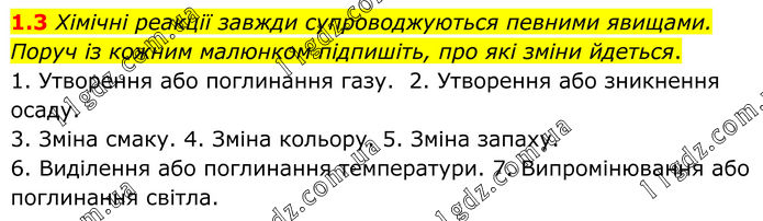 1.3 Хімічні реакції завжди супроводжуються певними явищами. Поруч із кожним малюнком підпишіть, про які зміни йдеться. 1. Утворення або поглинання газу. 2. Утворення або зникнення осаду. 3. Зміна смаку. 4. Зміна кольору. 5. Зміна запаху. 6. Виділення або поглинання температури. 7. Випромінювання або поглинання світла.