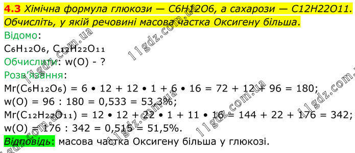 4.3 Хімічна формула глюкози — C6H12O6, а сахарози — C12H22O11. Обчисліть, у якій речовині масова частка Оксигену більша. Відомо: C₆H₁₂O₆, C₁₂H₂₂O₁₁ Обчислити: w(O) - ? Розв’язання: Mr(C₆H₁₂O₆) = 6 • 12 + 12 • 1 + 6 • 16 = 72 + 12 + 96 = 180; w(O) = 96 : 180 = 0,533 = 53,3%; Mr(C₁₂H₂₂O₁₁) = 12 • 12 + 22 • 1 + 11 • 16 = 144 + 22 + 176 = 342; w(O) = 176 : 342 = 0,515 = 51,5%. Відповідь: масова частка Оксигену більша у глюкозі.