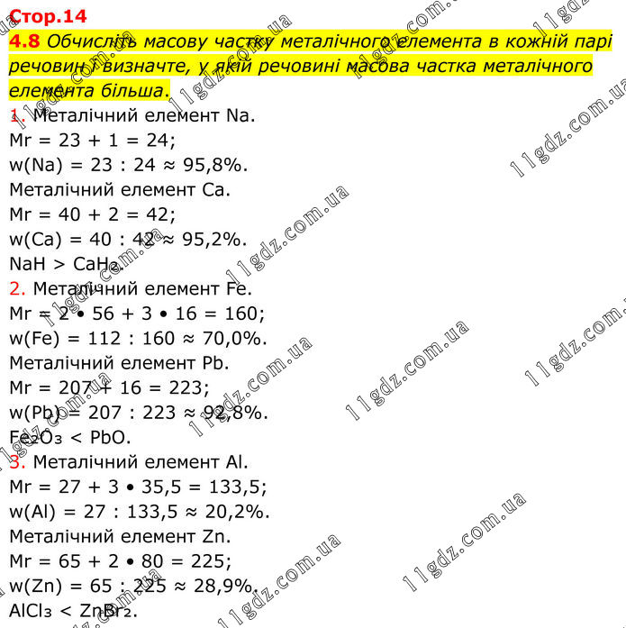 4.8 Обчисліть масову частку металічного елемента в кожній парі речовин і визначте, у якій речовині масова частка металічного елемента більша. 1. Металічний елемент Na. Mr = 23 + 1 = 24; w(Na) = 23 : 24 ≈ 95,8%. Металічний елемент Ca. Mr = 40 + 2 = 42; w(Ca) = 40 : 42 ≈ 95,2%. NaH > CaH₂. 2. Металічний елемент Fe. Mr = 2 • 56 + 3 • 16 = 160; w(Fe) = 112 : 160 ≈ 70,0%. Металічний елемент Pb. Mr = 207 + 16 = 223; w(Pb) = 207 : 223 ≈ 92,8%. Fe₂O₃ < PbO. 3. Металічний елемент Al. Mr = 27 + 3 • 35,5 = 133,5; w(Al) = 27 : 133,5 ≈ 20,2%. Металічний елемент Zn. Mr = 65 + 2 • 80 = 225; w(Zn) = 65 : 225 ≈ 28,9%. AlCl₃ < ZnBr₂.