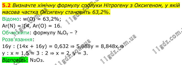 5.2 Визначте хімічну формулу сполуки Нітрогену з Оксигеном, у якій масова частка Оксигену становить 63,2%. Відомо: w(O) = 63,2%; Ar(N) = 14, Ar(O) = 16. Обчислити: формулу NₓOᵧ – ? Розв’язання: 16y : (14x + 16y) = 0,632 ⇒ 5,888y = 8,848x ⇒ y : x ≈ 1,5 ≈ 3 : 2 ⇒ x = 2, y = 3. Відповідь: N₂O₃.