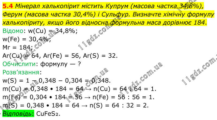 5.4 Мінерал халькопірит містить Купрум (масова частка 34,8%), Ферум (масова частка 30,4%) і Сульфур. Визначте хімічну формулу халькопіриту, якщо його відносна формульна маса дорівнює 184. Відомо: w(Cu) = 34,8%; w(Fe) = 30,4%; Mr = 184; Ar(Cu) = 64, Ar(Fe) = 56, Ar(S) = 32. Обчислити: формулу — ? Розв’язання: w(S) = 1 − 0,348 − 0,304 = 0,348. m(Cu) = 0,348 • 184 = 64 → n(Cu) = 64 : 64 = 1. m(Fe) = 0,304 • 184 = 56 → n(Fe) = 56 : 56 = 1. m(S) = 0,348 • 184 = 64 → n(S) = 64 : 32 = 2. Відповідь: CuFeS₂.