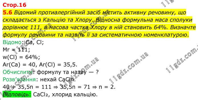 5.6 Відомий протиалергійний засіб містить активну речовину, що складається з Кальцію та Хлору. Відносна формульна маса сполуки дорівнює 111, а масова частка Хлору в ній становить 64%. Визначте формулу речовини та назвіть її за систематичною номенклатурою. Відомо: Ca, Cl; Mr = 111; w(Cl) = 64%; Ar(Ca) = 40, Ar(Cl) = 35,5. Обчислити: формулу та назву — ? Розв’язання: нехай CaCln. 40 + 35,5n = 111 ⇒ 35,5n = 71 ⇒ n = 2. Відповідь: CaCl₂, хлорид кальцію.