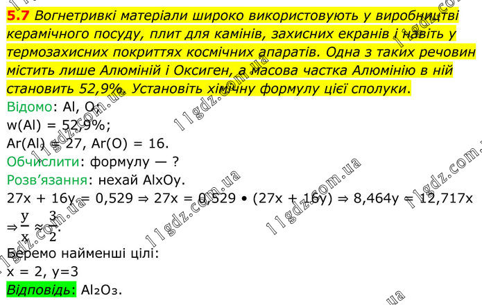 5.7 Вогнетривкі матеріали широко використовують у виробництві керамічного посуду, плит для камінів, захисних екранів і навіть у термозахисних покриттях космічних апаратів. Одна з таких речовин містить лише Алюміній і Оксиген, а масова частка Алюмінію в ній становить 52,9%. Установіть хімічну формулу цієї сполуки. Відомо: Al, O; w(Al) = 52,9%; Ar(Al) = 27, Ar(O) = 16. Обчислити: формулу — ? Розв’язання: нехай AlxOy. 27x + 16y = 0,529 ⇒ 27x = 0,529 • (27x + 16y) ⇒ 8,464y = 12,717x ⇒ y/x ≈ 3/2. Беремо найменші цілі: x = 2, y=3 Відповідь: Al₂O₃.