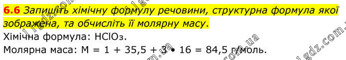 6.6 Запишіть хімічну формулу речовини, структурна формула якої зображена, та обчисліть її молярну масу. Хімічна формула: HClO₃. Молярна маса: M = 1 + 35,5 + 3 • 16 = 84,5 г/моль.