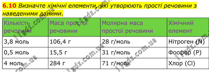 6.10 Визначте хімічні елементи, які утворюють прості речовини з наведеними даними. Кількість речовини Маса простої речовини Молярна маса простої речовини Хімічний елемент 3,8 моль 106,4 г 28 г/моль Нітроген (N) 0,5 моль 15,5 г 31 г/моль Фосфор (P) 4 моль 284 г 71 г/моль Хлор (Cl)