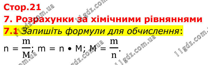 7. Розрахунки за хімічними рівняннями 7.1 Запишіть формули для обчислення: n = m/M; m = n • M; M = m/n.