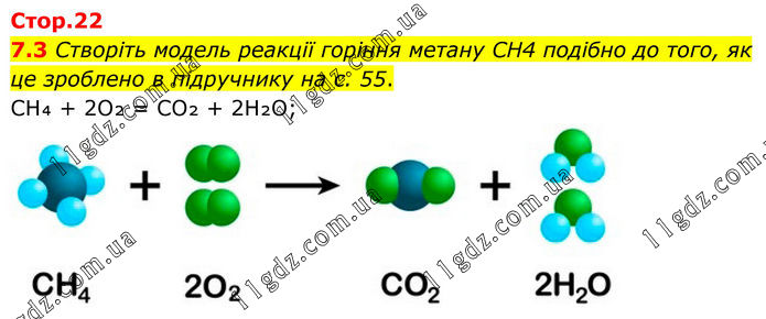 7.3 Створіть модель реакції горіння метану CH4 подібно до того, як це зроблено в підручнику на с. 55. CH₄ + 2O₂ = CO₂ + 2H₂O;