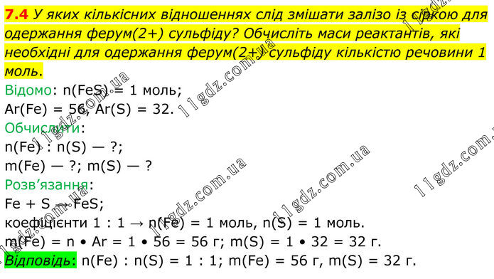 7.4 У яких кількісних відношеннях слід змішати залізо із сіркою для одержання ферум(2+) сульфіду? Обчисліть маси реактантів, які необхідні для одержання ферум(2+) сульфіду кількістю речовини 1 моль. Відомо: n(FeS) = 1 моль; Ar(Fe) = 56, Ar(S) = 32. Обчислити: n(Fe) : n(S) — ?; m(Fe) — ?; m(S) — ? Розв’язання: Fe + S → FeS; коефіцієнти 1 : 1 → n(Fe) = 1 моль, n(S) = 1 моль. m(Fe) = n • Ar = 1 • 56 = 56 г; m(S) = 1 • 32 = 32 г. Відповідь: n(Fe) : n(S) = 1 : 1; m(Fe) = 56 г, m(S) = 32 г.