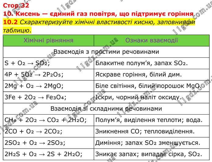 10. Кисень — єдиний газ повітря, що підтримує горіння 10.2 Схарактеризуйте хімічні властивості кисню, заповнивши таблицю. Хімічні рівняння Ознаки взаємодії Взаємодія з простими речовинами S + O₂ → SO₂; Блакитне полум’я, запах SO₂. 4P + 5O₂ → 2P₂O₅; Яскраве горіння, білий дим. 2Mg + O₂ → 2MgO; Біле світіння, білий порошок MgO. 3Fe + 2O₂ → Fe₃O₄; Іскри, чорний наліт оксиду. Взаємодія зі складними речовинами CH₄ + 2O₂ → CO₂ + 2H₂O; Полум’я, виділення теплоти; вода. 2CO + O₂ → 2CO₂; Зникнення CO; тепловиділення. 2SO₂ + O₂ → 2SO₃; Диміння; запах SO₂ зменшується. 2H₂S + O₂ → 2S + 2H₂O; Зникає запах; випадає сірка, SO₂.
