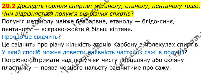 20.2 Дослідіть горіння спиртів: метанолу, етанолу, пентанолу тощо. Чим відрізняється полум'я від різних спиртів? Полум’я метанолу майже безбарвне, етанолу — блідо-синє, пентанолу — яскраво-жовте й більш кіптяве. Про що це свідчить? Це свідчить про різну кількість атомів Карбону в молекулах спиртів. У який спосіб можна довести наявність часточок сажі в полум’ї? Потрібно потримати над полум’ям чисту порцеляну або скляну пластинку — поява чорного нальоту свідчитиме про сажу.