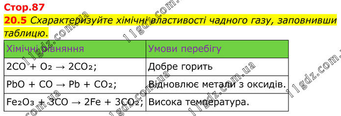 20.5 Схарактеризуйте хімічні властивості чадного газу, заповнивши таблицю.