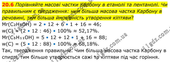 20.6 Порівняйте масові частки Карбону в етанолі та пентанолі. Чи правильним є твердження: чим більша масова частка Карбону в речовині, тим більша ймовірність утворення кіптяви? Mr(C₂H₅OH) = 2 • 12 + 6 • 1 + 16 = 46; w(C) = (2 • 12 : 46) • 100% ≈ 52,17%. Mr(C₅H₁₁OH) = 5 • 12 + 12 • 1 + 16 = 88; w(C) = (5 • 12 : 88) • 100% ≈ 68,18%. Так, твердження правильне. Чим більша масова частка Карбону в спирті, тим більше утворюється сажі та кіптяви під час горіння.