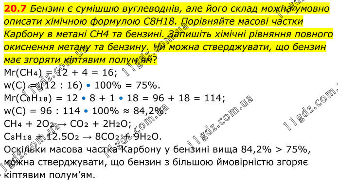 20.7 Бензин є сумішшю вуглеводнів, але його склад можна умовно описати хімічною формулою C8H18. Порівняйте масові частки Карбону в метані CH4 та бензині. Запишіть хімічні рівняння повного окиснення метану та бензину. Чи можна стверджувати, що бензин має згоряти кіптявим полум'ям? Mr(CH₄) = 12 + 4 = 16; w(C) = (12 : 16) • 100% = 75%. Mr(C₈H₁₈) = 12 • 8 + 1 • 18 = 96 + 18 = 114; w(C) = 96 : 114 • 100% ≈ 84,2%. CH₄ + 2O₂ → CO₂ + 2H₂O; C₈H₁₈ + 12.5O₂ → 8CO₂ + 9H₂O. Оскільки масова частка Карбону у бензині вища 84,2% > 75%, можна стверджувати, що бензин з більшою ймовірністю згоряє кіптявим полум’ям.