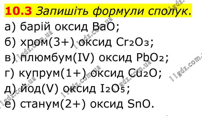 10.3 Запишіть формули сполук. а) барій оксид BaO; б) хром(3+) оксид Cr₂O₃; в) плюмбум(ІV) оксид PbO₂; г) купрум(1+) оксид Cu₂O; д) йод(V) оксид I₂O₅; е) станум(2+) оксид SnO.