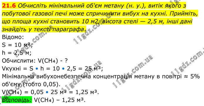 21.6 Обчисліть мінімальний об'єм метану (н. у.), витік якого з побутової газової печі може спричинити вибух на кухні. Прийміть, що площа кухні становить 10 м2, висота стелі — 2,5 м, інші дані знайдіть у тексті параграфа. Відомо: S = 10 м²; h = 2,5 м; Обчислити: V(CH₄) - ? Vкухні = S • h = 10 • 2,5 = 25 м³; Мінімальна вибухонебезпечна концентрація метану в повітрі ≈ 5% об'єму (тобто 0,05). V(CH₄) = 0,05 • 25 м³ = 1,25 м³. Відповідь: V(CH₄) – 1,25 м³.