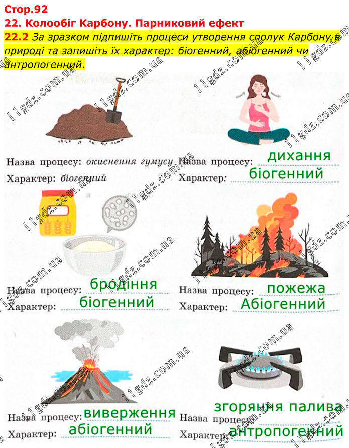 22. Колообіг Карбону. Парниковий ефект 22.2 За зразком підпишіть процеси утворення сполук Карбону в природі та запишіть їх характер: біогенний, абіогенний чи антропогенний.