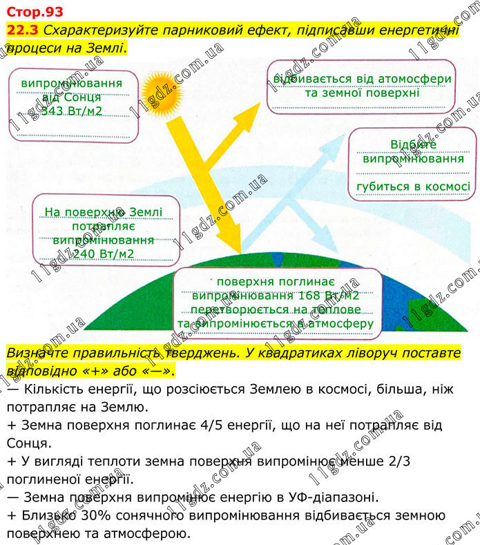 22.3 Схарактеризуйте парниковий ефект, підписавши енергетичні процеси на Землі. Визначте правильність тверджень. У квадратиках ліворуч поставте відповідно «+» або «—». — Кількість енергії, що розсіюється Землею в космосі, більша, ніж потрапляє на Землю. + Земна поверхня поглинає 4/5 енергії, що на неї потрапляє від Сонця. + У вигляді теплоти земна поверхня випромінює менше 2/3 поглиненої енергії. — Земна поверхня випромінює енергію в УФ-діапазоні. + Близько 30% сонячного випромінювання відбивається земною поверхнею та атмосферою.