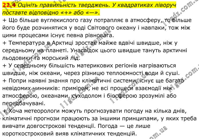 22.4 Оцініть правильність тверджень. У квадратиках ліворуч поставте відповідно «+» або «—». + Щo більше вуглекислого газу потрапляє в атмосферу, то більше його буде розчинятися у воді Світового океану і навпаки, тож між цими процесами існує певна рівновага. + Температура в Арктиці зростає майже вдвічі швидше, ніж у середньому на планеті. Унаслідок цього швидше тануть арктичні льодовики та морський лід. + У середньому більшість материкових регіонів нагріваються швидше, ніж океани, через різницю теплоємності води й суші. + Попри наявні знання про кліматичні системи, існує ще багато невідомих чинників: приміром, не всі процеси взаємодії між атмосферою, океанами, суходолом і біосферою зрозумілі або передбачувані. + Хоча метеорологи можуть прогнозувати погоду на кілька днів, кліматичні прогнози працюють за іншими принципами, у яких треба вивчати довгострокові тенденції. Погода — це лише короткостроковий вияв кліматичних тенденцій.