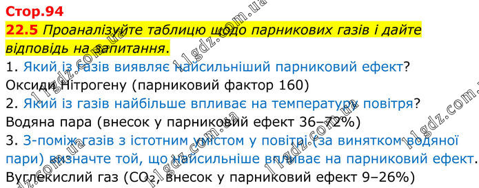 22.5 Проаналізуйте таблицю щодо парникових газів і дайте відповідь на запитання. 1. Який із газів виявляє найсильніший парниковий ефект? Оксиди Нітрогену (парниковий фактор 160) 2. Який із газів найбільше впливає на температуру повітря? Водяна пара (внесок у парниковий ефект 36–72%) 3. З-поміж газів з істотним умістом у повітрі (за винятком водяної пари) визначте той, що найсильніше впливає на парниковий ефект. Вуглекислий газ (CO₂, внесок у парниковий ефект 9–26%)