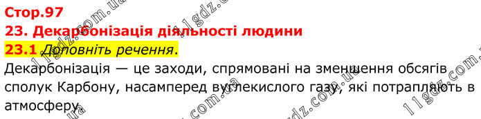 23. Декарбонізація діяльності людини 23.1 Доповніть речення. Декарбонізація — це заходи, спрямовані на зменшення обсягів сполук Карбону, насамперед вуглекислого газу, які потрапляють в атмосферу.