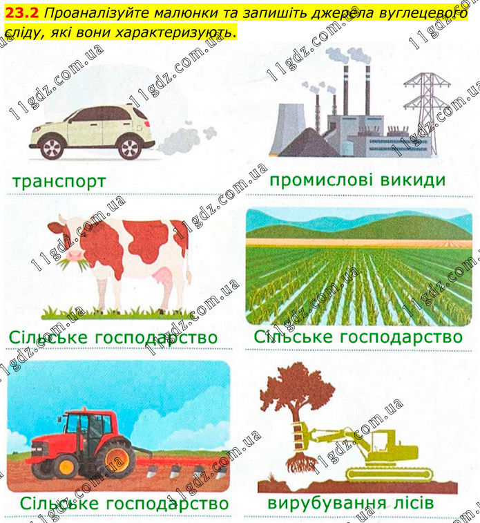 23.2 Проаналізуйте малюнки та запишіть джерела вуглецевого сліду, які вони характеризують.