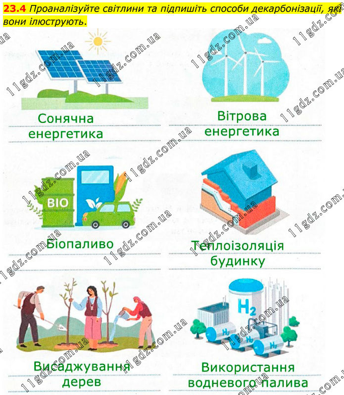 23.4 Проаналізуйте світлини та підпишіть способи декарбонізації, які вони ілюструють.