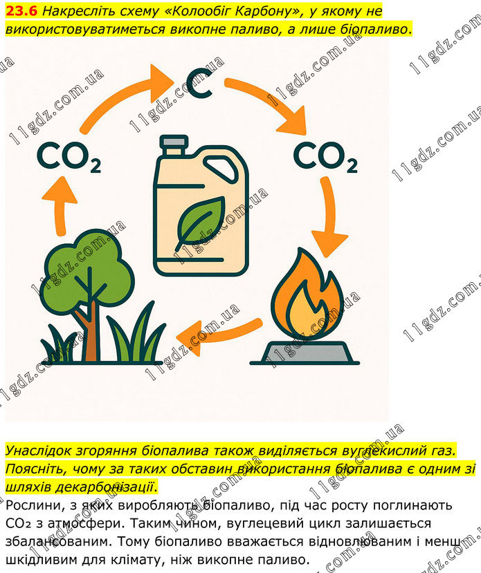 23.6 Накресліть схему «Колообіг Карбону», у якому не використовуватиметься викопне паливо, а лише біопаливо. Унаслідок згоряння біопалива також виділяється вуглекислий газ. Поясніть, чому за таких обставин використання біопалива є одним зі шляхів декарбонізації. Рослини, з яких виробляють біопаливо, під час росту поглинають CO₂ з атмосфери. Таким чином, вуглецевий цикл залишається збалансованим. Тому біопаливо вважається відновлюваним і менш шкідливим для клімату, ніж викопне паливо.