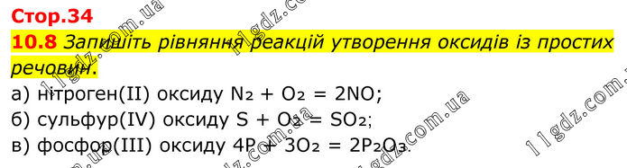 10.8 Запишіть рівняння реакцій утворення оксидів із простих речовин. а) нітроген(ІІ) оксиду N₂ + O₂ = 2NO; б) сульфур(ІV) оксиду S + O₂ = SO₂; в) фосфор(ІІІ) оксиду 4P + 3O₂ = 2P₂O₃.