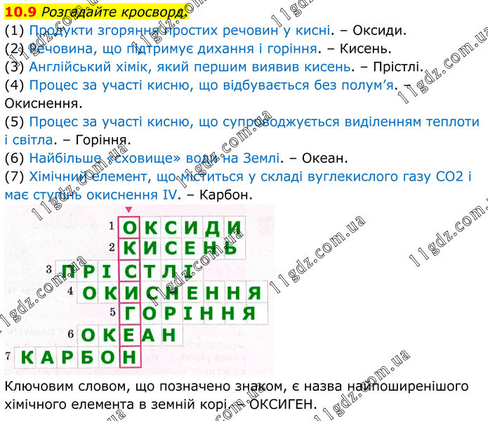 10.9 Розгадайте кросворд. (1) Продукти згоряння простих речовин у кисні. – Оксиди. (2) Речовина, що підтримує дихання і горіння. – Кисень. (3) Англійський хімік, який першим виявив кисень. – Прістлі. (4) Процес за участі кисню, що відбувається без полум’я. – Окиснення. (5) Процес за участі кисню, що супроводжується виділенням теплоти і світла. – Горіння. (6) Найбільше «сховище» води на Землі. – Океан. (7) Хімічний елемент, що міститься у складі вуглекислого газу CO2 і має ступінь окиснення IV. – Карбон. Ключовим словом, що позначено знаком, є назва найпоширенішого хімічного елемента в земній корі. – ОКСИГЕН.