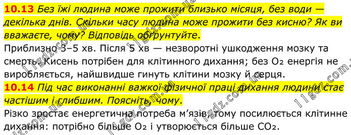 10.13 Без їжі людина може прожити близько місяця, без води — декілька днів. Скільки часу людина може прожити без кисню? Як ви вважаєте, чому? Відповідь обґрунтуйте. Приблизно 3–5 хв. Після 5 хв — незворотні ушкодження мозку та смерть. Кисень потрібен для клітинного дихання; без O₂ енергія не виробляється, найшвидше гинуть клітини мозку й серця. 10.14 Під час виконанні важкої фізичної праці дихання людини стає частішим і глибшим. Поясніть, чому. Різко зростає енергетична потреба м’язів, тому посилюється клітинне дихання: потрібно більше O₂ і утворюється більше CO₂.